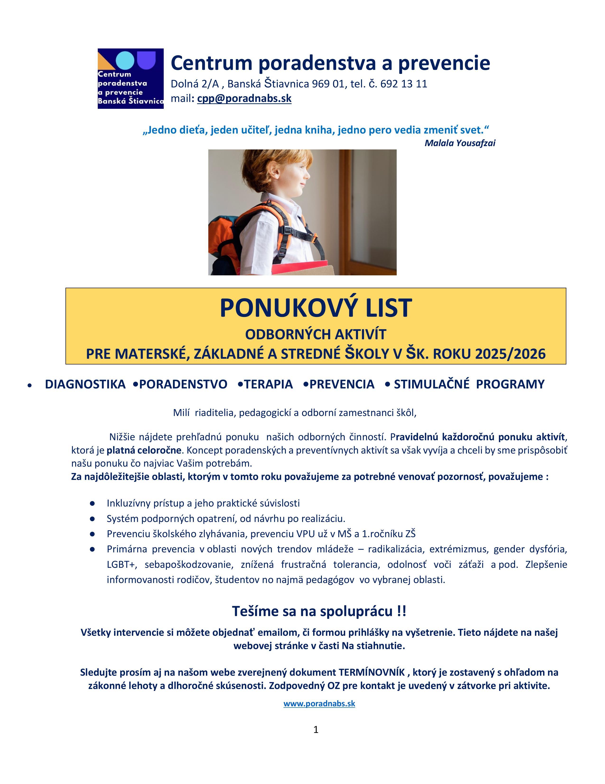 Aj v tomto školskom roku sme si pre Vás pripravili množstvo zaujímavých ponúk preventívnych a intervenčných aktivít, zameraných na všetky aktuálne trendy v starosltivosti o duševné zdravie a vývoj detí .